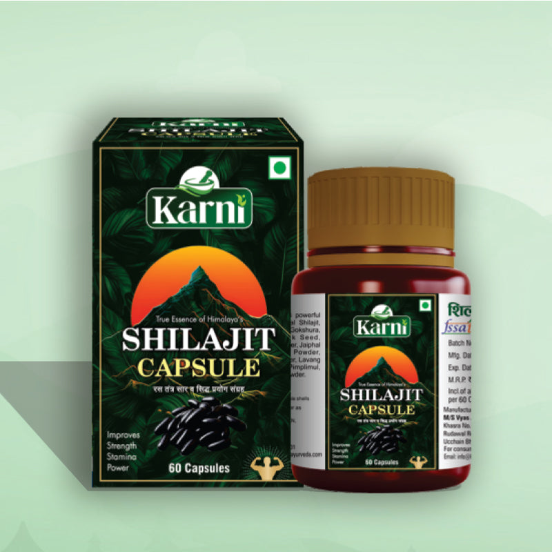 Karni Shilajit Capsule contains purified Himalayan Shilajit in convenient capsule form. It's a natural mineral complex that enhances energy, vitality, and overall health through its rich mineral content and fulvic acid.